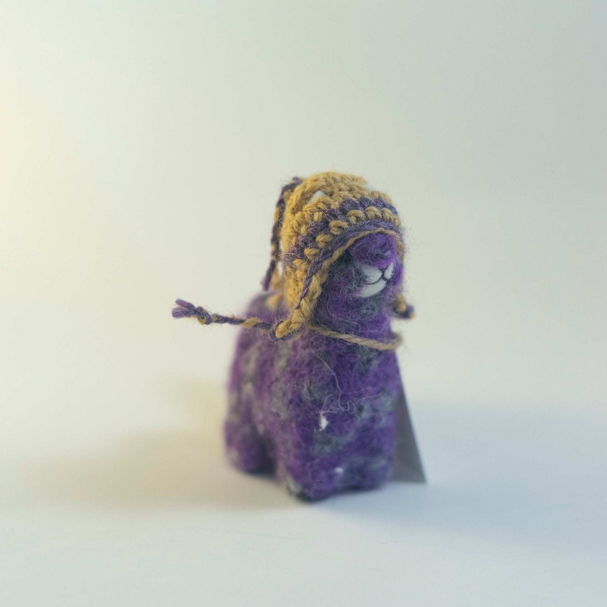 This 3.5-inch alpaca figurine is dressed in a vibrant purple and yellow Chullo hat, capturing the charm of traditional Andean style. Its soft, fuzzy texture and bright colors make it a delightful decorative piece or thoughtful gift.