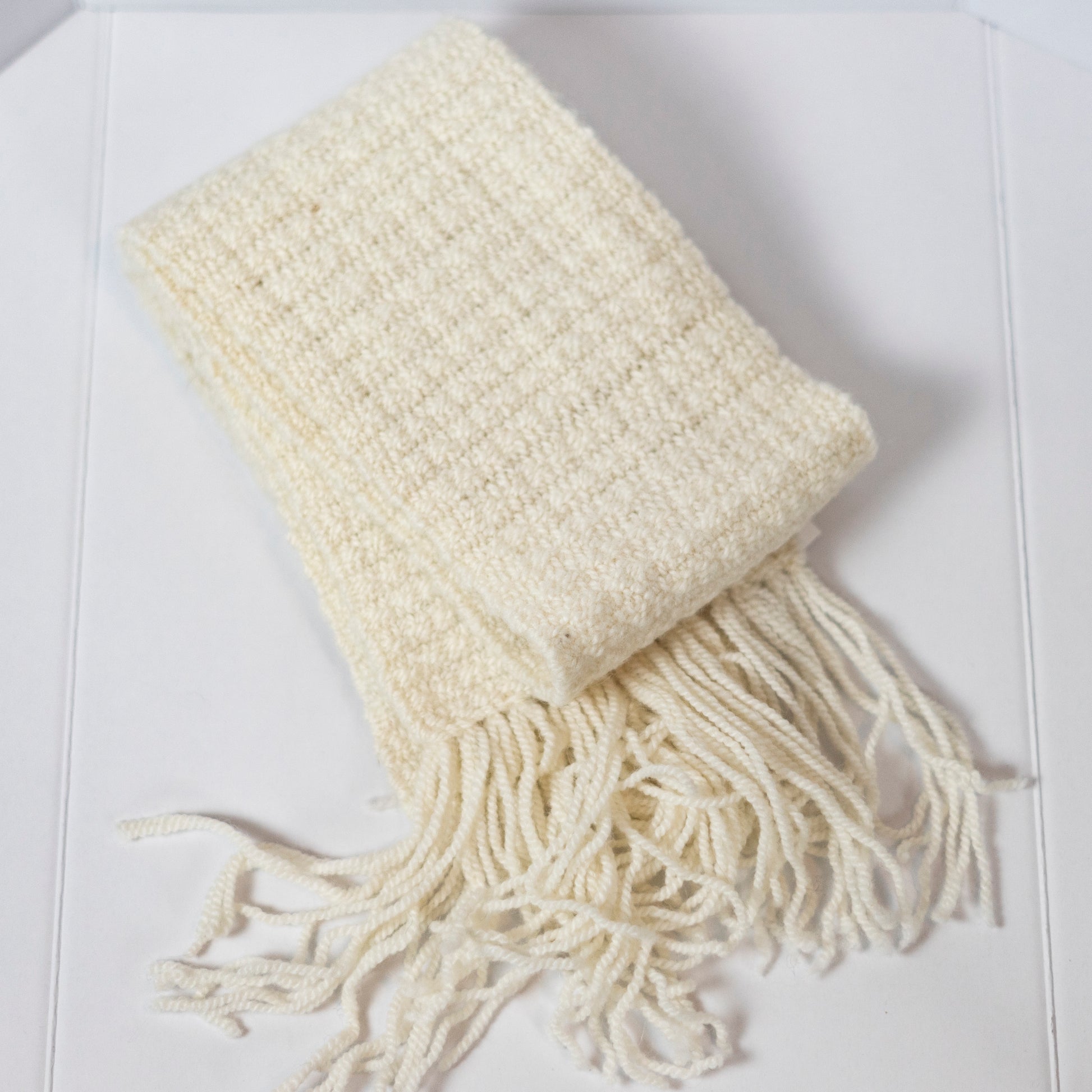 Handwoven by alpaca friend and mentor, Linnea Laurila, these scarves are crafted with care using soft, high-quality alpaca fiber produced from our national AOA 2022 winner, Irish Meadows' Maxi. Maxi's yarn delivers luxurious warmth and an elegant drape. Each piece showcases Linnea’s unique touch through distinctive weaving patterns, blending artisanal tradition with contemporary style. The beige scarf measures 5" X 53 1/2". The dark gray is 6 1/2 X 65".